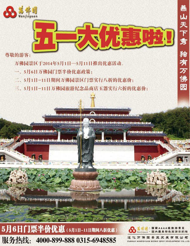 尊敬的游客: 万佛园景区于2014年5月1日—5月11日推出优惠活动。 一、5月6日万佛园门票半价优惠政策; 二、..