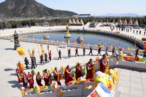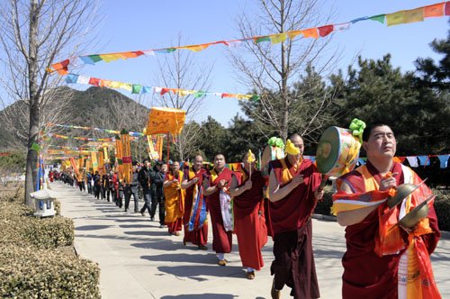 3月25日12点30分,由青海塔尔寺巴玛彭措大师住持主持洒净仪式,众多居士、信众共同参与。杨枝净水,遍洒三千,性空八德利人天,福寿广增延。万佛园洒净仪式队伍绕万佛园园区一周,给全园带来吉祥。