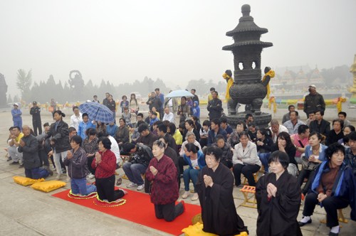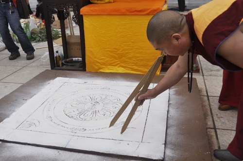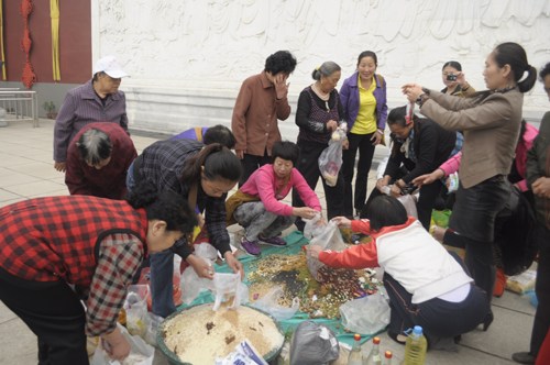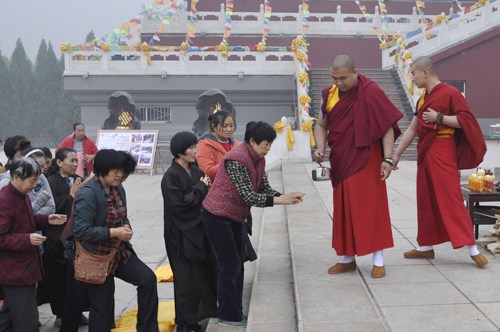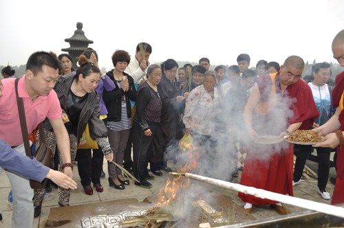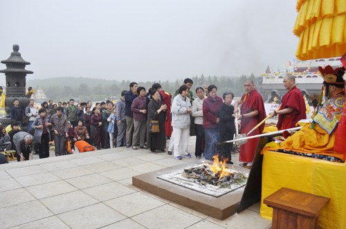 以下是火供法会现场图片:图:喇嘛大师正在火供台上写“大威德金刚”的火供坛城图:信众们带来大米、芝麻、豆子等供养火供图:信众们正在写祈福条和往生条图:供养火供仪式开始图:火供法会上,各信众虔诚祈福图:信众们排队供养火供图:喇嘛大师向信众们手中倒入肖酸(酸奶)等调制的功德水图:最后,信众们将火供物品全部倒入火供坛城上,供养火供