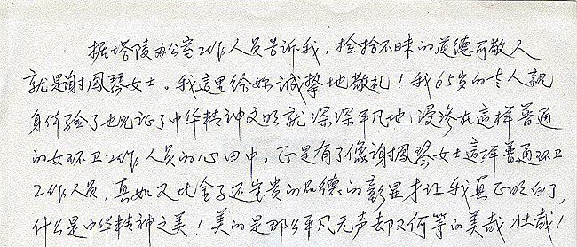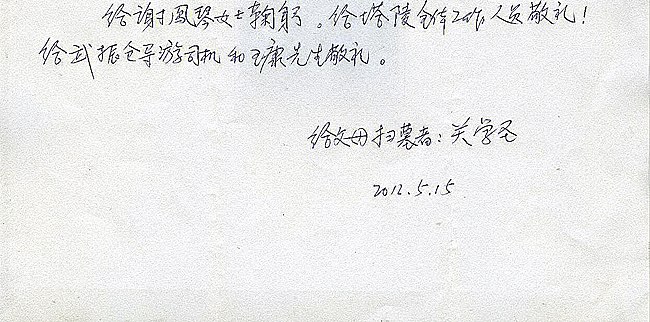 后来关先生多次给万佛园来电表示感谢,并表示给拾金不昧的谢凤琴送上感谢信。