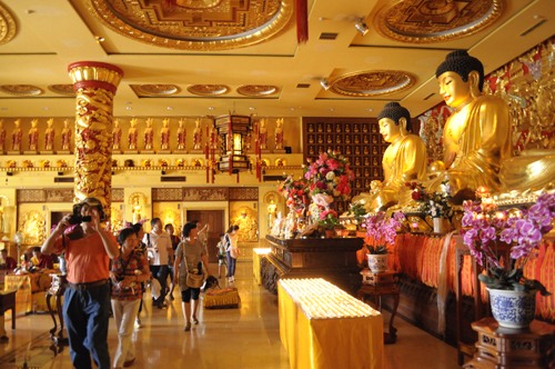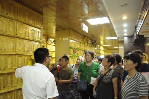 上午10点整,双龙山公墓考察团抵达万佛园。稍作休息,由万佛园导购人员及导游员带领考察客人分别参观了金宝塔东侧成品艺术墓区、金宝塔福位箱体、墓台区等墓区,及园区的主要景点。