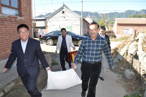 图:东陵乡武装部部长任俊(图右)与万佛园工作人员抬着大袋面粉送中秋礼