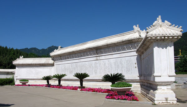 进入山门,一座长16米,高4.5米的汉白玉孝经影壁就深深的吸引了大家的眼球,在这座汉白玉孝经影壁中刻着儒家十三经中最著名的《孝经》。宣扬了中华民族的孝道文明。经文的大意是:君王、臣子、百官、庶民都要遵从“百善孝为先”的思想, 为国尽忠,为父母尽孝,是做人的根本, 它的精神应为华夏子孙去继承和光大。